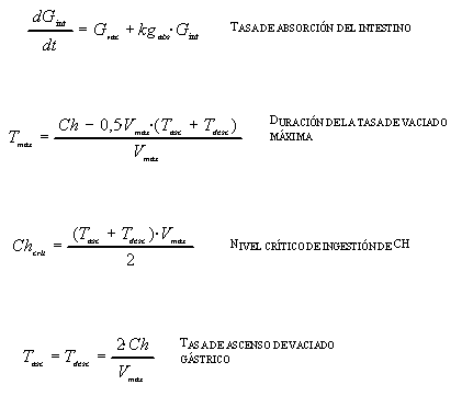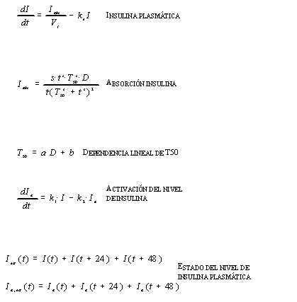 La excreción de la glucosa del compartimento extracelular, mediante el sistema renal, tiene lugar cuando el nivel glucémico supera el umbral de excreción renal como una función del ratio de aclaramiento de creatinina. La única entrada de insulina en el modelo llega a través de la absorción de la misma en el lugar donde anteriormente se ha realizado la inyección subcutánea de la dosis de insulina exógena. En el apéndice B se recogen las expresiones matemáticas que se corresponden con el esquema del modelo fisiológico utilizado por el sistema, cuya estructura muestra la figura 2.
