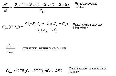 El modelo, asume un paciente completamente privado de secreción de insulina endógena y contempla un compartimento extracelular simple en el cual la glucosa entra vía absorción intestinal y producción hepática. La glucosa, en su mayor parte, llega al torrente sanguíneo a través de la absorción intestinal y se retira del compartimento extracelular a través de la utilización independiente de la insulina del sistema nervioso central y los glóbulos rojos, además de la utilización dependiente de la insulina del hígado y el resto de los tejidos dependientes de la insulina.