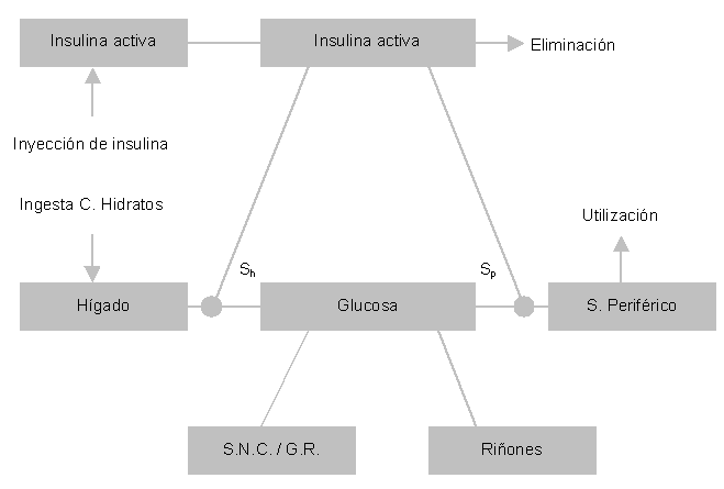 El manejo de la glucosa por el sistema hepático y el sistema periférico se trata de forma separada en el modelo. En el tratamiento del nivel de glucosa de la red hepática se ha seguido el trabajo de Guyton de la homeostasís de la insulina [8], se calcula como la suma de la descomposición del glucógeno y la síntesis del glucógeno en su caso dependiendo de los niveles sanguíneos de glucosa e insulina. Se considera, Sh, como el parámetro de sensibilidad hepática a la insulina, y Sp, como el parámetro de sensibilidad periférica a la insulina cuyos valores oscilarán entre 0 y 1. Dichos parámetros, Sh y Sp, se utilizan para ajustar el modelo al caso particular de cada paciente.
