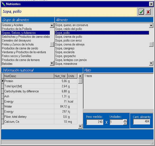 Para simplificar la configuración de la dieta, es posible definir la dieta a partir de las unidades predeterminadas, propias de cada alimento preparado, disponiendo de su peso en gramos así como del valor calórico asociado (taza de leche, plato de sopa, etc...), tal y como se aprecia en la figura 3.
