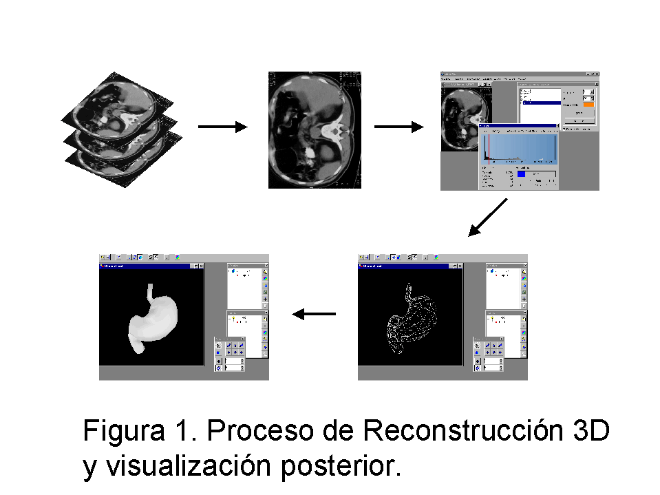 Se ha diseñado un método para obtener, a distancia, reconstrucciones tridimensionales partiendo de imágenes CT. Este método se basa en la combinación de varios métodos de procesamiento de imagen bien conocidos8,10 y un sistema de telecomunicaciones estándar. Para llevar a cabo este método se ha desarrollado una aplicación informática. Este programa de ordenador aporta importantes funciones novedosas además de realizar reconstrucciones tridimensionales a distancia. Con este software se puede, desde un PC remoto, hacer una reconstrucción 3D en la estación de trabajo. El modelo 3D se crea a partir de imágenes CT previamente almacenadas en el SATI.