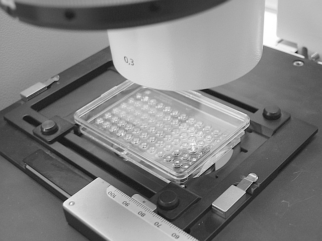 Los grupos de imágenes de trabajo (incógnita y control) se obtienen a través de un microscopio invertido Axiovert 100 (Carl Zeiss, Germany) y una cámara digital SPOT (Diagnostic Instruments, Inc.). Se fijan las condiciones óptimas de adquisición en cuanto a luminosidad, contraste, número de aumentos, tiempo de exposición, etc. Las imágenes son adquiridas secuencialmente con 10 aumentos y 256 niveles de gris, lo que resulta en un tamaño por imagen de 328x256 puntos, y un tamaño de fichero imagen (formato bmp) de 84K. Cada microplaca genera 72 imágenes de las que 12 son controles y el resto incógnitas. Las imágenes son almacenadas ordenadamente, creándose automáticamente un árbol de directorios semejante a la jerarquía del experimento: experimento -> serie -> placa. Como ya se comentó, la ubicación de los pocillos de control está protocolizada, por lo que en un experimento estándar no se necesita hacer "a priori" un marcado para la localización de las imágenes control.