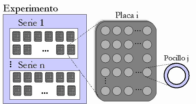 Los dos niveles superiores (experimento, serie) tienen un carácter más organizador que operativo; los dos niveles inferiores (placa, pocillo) son en los que se trabaja durante el procesamiento. Dentro de una placa se pueden encontrar tres tipos de pocillos: 1) no usados, marcados previamente y que no intervienen en los procedimientos posteriores; 2) pocillos de control, en número determinado y repartidos de forma dispersa pero predeterminada en la placa, en los que las células han sido cultivadas en ausencia de inhibidores; y 3) pocillos incógnita, en los que se pretende determinar el grado de inhibición producido por el reactivo introducido, relativo al conjunto de los pocillos control.