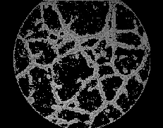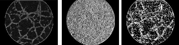 2) El siguiente paso es el realce de las interconexiones celulares o canales. Para destacar los canales se adopta una estrategia indirecta, ya que no se aborda el problema identificando directamente los canales, sino que se discrimina el fondo de las imágenes que tiene una textura uniforme y regular en comparación con los canales. Para diferenciar el fondo del resto de la imagen, se realzan los bordes de la imagen en magnitud (ver Fig.6) y fase (ver Fig.7) mediante derivadas perpendiculares (método de Sobel). Tomando agrupaciones relativamente grandes de puntos [15x15], se efectúa un análisis no lineal de la imagen, determinando la media y varianza de la magnitud absoluta de los bordes. Se obtiene de esta forma una sencilla referencia estadística diferenciadora del fondo y los canales. Para mejorar la diferenciación es necesario incluir un criterio de fase teniendo en cuenta la linealidad de los canales; se procesa la imagen de fases, indicadora de la dirección de los bordes, de forma que se destacan las zonas que mantienen un determinado criterio de linealidad. Como resultado se obtiene una imagen binaria (ver Fig.8) en la que quedan marcadas las zonas alineadas con apertura inferior a 20º.