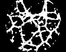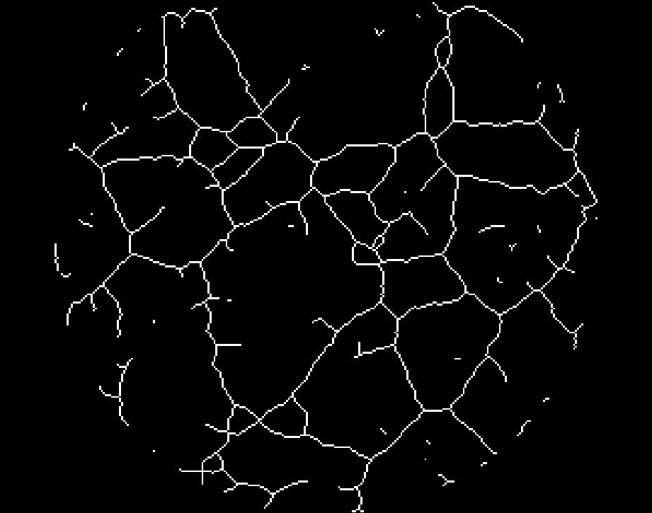 El siguiente procedimiento es aplicar un proceso de binarización (ver Fig.11), seguido de otro de esqueletonización (ver Fig.12), de forma que quedan perfectamente delineados los canales detectados. En la figura 13 se puede observar la superposición de la imagen resultantes del pre-procesamiento (paso 1) y del procesamiento (paso 2); se marcan en negro los canales conectados y en blanco los canales aislados (no conectados).