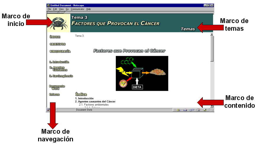 El marco de contenido, además de mostrar los contenidos elegidos, permite al usuario moverse por el tema en concreto utilizando el ratón y las barras de desplazamiento.