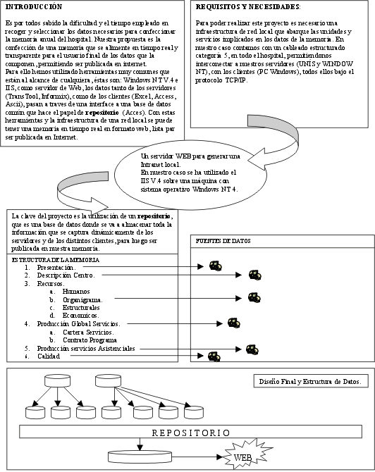 Se trata de presentar el esquema utilizado, para recoger los datos de los distintos servicios y unidades, unificándolos todos en una base de datos única, "repositorio", y a partir de ahí generar en formato WEB, la Memoria Anual del Hospital. De esta forma se alimenta esa memória en tiempo real y sin gasto en recursos humanos para la recogida y la presentación de los datos que la componen.