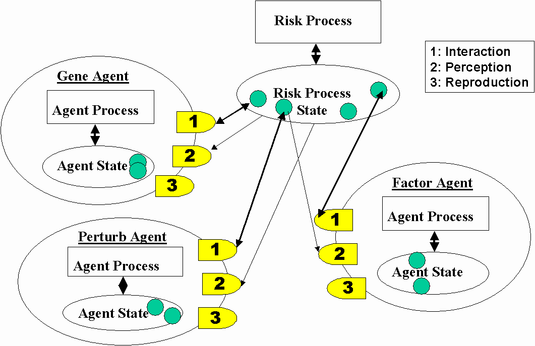 En el Agente Riesgo, se modela la estructura y comportamiento de cada uno de los elementos que se sabe tienen influencia en la variación del CVDR, en función del grado de conocimiento que se tiene de ellos, pero tratando de encontrar un modo en el que puedan comunicarse entre ellos de forma estándar. De esta comunicación puede surgir el comportamiento emergente que aporte la solución buscada.