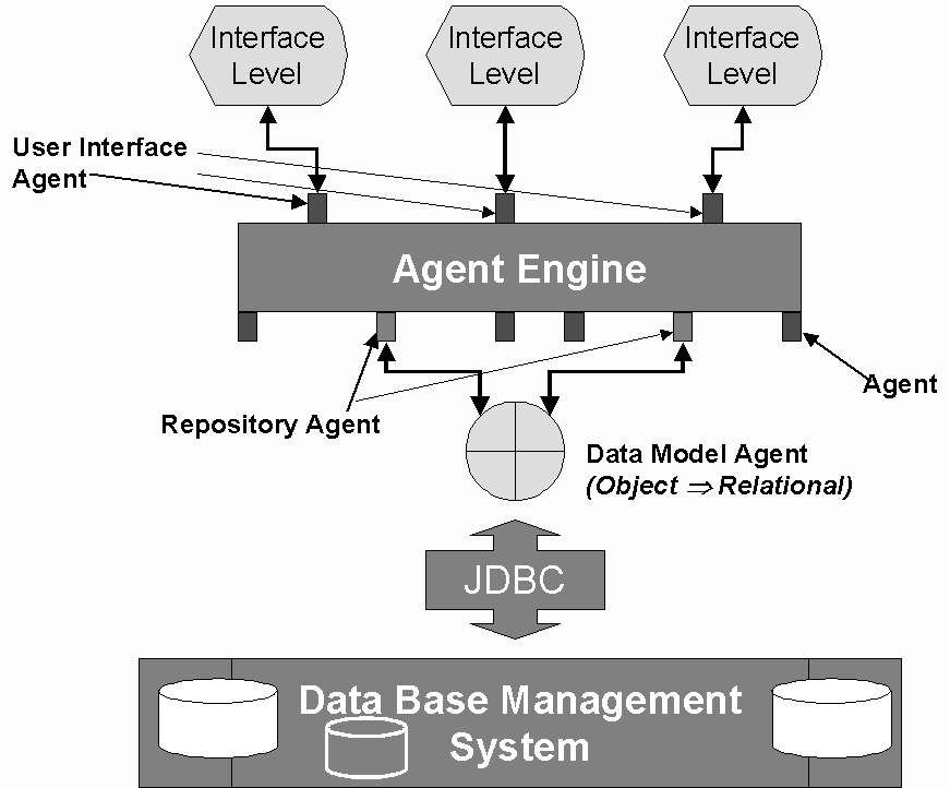 La naturaleza heterogénea de los entornos utilizados apoya la adopción de una arquitectura de agentes. Por tanto, se ha diseñado la arquitectura software de forma que se distribuye en tres capas: Interfaz, Motor de Agente y Base de Datos (véase la Figura 3). El Nivel de Interfaz está desarrollándose en Delphi, ya que permite mejor flexibilidad y rapidez para obtener una interfaz de usuario lo más potente posible. El Motor de Agente está desarrollándose con Agent Builder y dará lugar a módulos Java que representan los distintos agentes del sistema. La utilización de Java permite que se utilice una Base de Datos independiente del resto de elementos del sistema y, mediante el protocolo JDBC (Java Data Base Connectivity), se puede utilizar por ejemplo cualquier gestor estándar como Oracle, SQL Server, DB2, etc. Si el modelo de datos del gestor es Objeto-Relacional, la conexión con el resto de la arquitectura es casi directa. Sin embargo, si se trata de un modelo Relacional, es necesario introducir un componente adicional que haga de interfase entre el sistema y la base de datos.