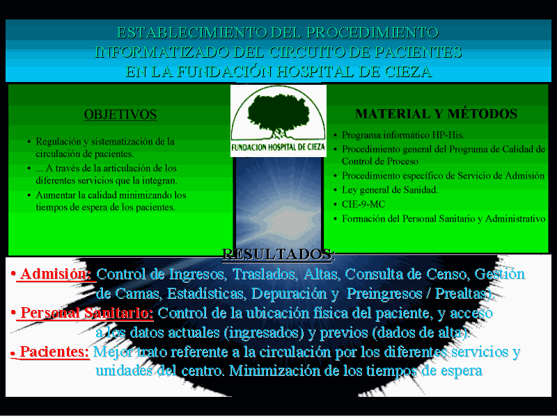 OBJETIVO: El objetivo de la puesta en marcha de esta aplicación es la regulación y sistematización de la circulación de pacientes en la FUNDACIÓN HOSPITAL DE CIEZA, a través de la articulación de los diferentes servicios que la integran (Admisión, Unidades de Hospitalización y Urgencias, Farmacia, Informática, Contabilidad y Gerencia) con el fin último de aumentar la calidad en cuanto a la minimización de los tiempos de espera de los pacientes.