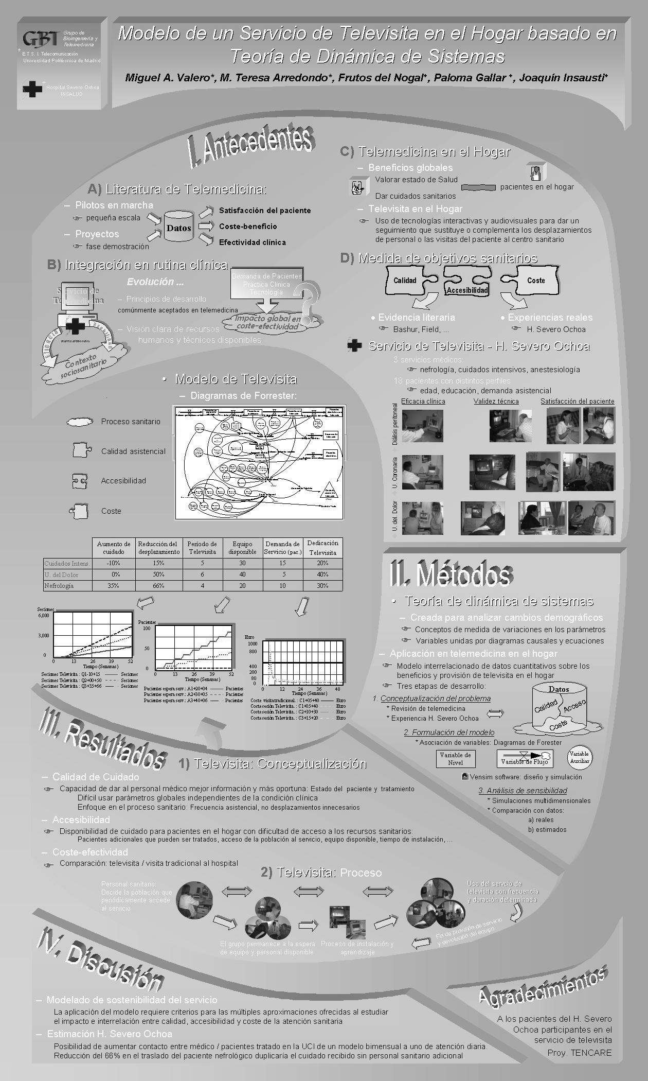 Se ha utilizado la dinámica de sistemas para desarrollar y validar un modelo interrelacionado de datos cuantitativos sobre el servicio de televisita. La conceptualización del problema combina los principales beneficios identificados en telemedicina con la experiencia del servicio de televisita desarrollado en el H. Severo Ochoa de Madrid con 15 pacientes y 3 servicios clínicos. La definición de ecuaciones y la estimación de resultados se basa en diagramas de Forrester. El modelo se validó mediante simulaciones iterativas contrastando estimaciones iniciales e información de experiencias reales.