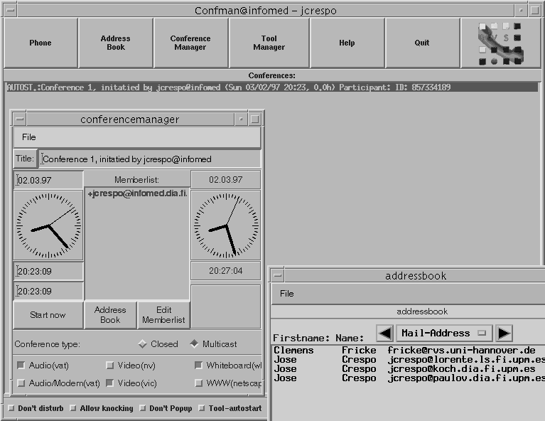 Los entornos colaborativos permiten seleccionar el tipo de sesión colaborativa a desarrollar entre los participantes. La Figura 1 muestra una herramienta de gestión de este tipo, la cual permite no sólo incluir a nuevos participantes (y dar de baja a otros), sino también introducir voz, espacios compartidos e, incluso, vídeo.