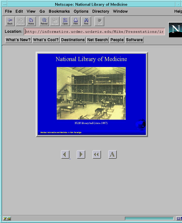 Otro tipo de sesiones que se pueden establecer fácilmente son las de tele-enseñanza. Se puede formar una sesión compartida en la que un grupo de médicos en formación naveguen en Internet conjuntamente con un instructor, de forma que las páginas accedidas por los estudiantes sean aquellas visitadas por el instructor. La Figura 2 muestra un ejemplo de utilización de un navegador Internet en este tipo de sesiones, en las que el instructor está accediendo a unas transparencias de un curso de introducción a la Informática Médica. Los navegadores ligados en la sesión colaborativa "seguirán" los accesos del instructor, pudiendo incorporarse fácilmente la voz del instructor (con una codificación de bajo bit-rate).