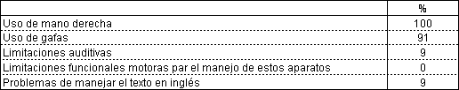 Tal como se observa en la Tabla 2 todos los miembros del grupo experimental eran diestros y la gran mayoría (10 sobre 11) usa gafas mientras que sólo un caso (1 de 11) presentaba limitaciones auditivas y nadie estaba afectado por limitaciones funcionales motoras relacionadas con el uso de los terminales. Los dispositivos terminales usados en este análisis eran de versión en Inglés. Sólo uno de los participantes ha señalado problemas con el manejo de los textos en este idioma.