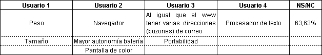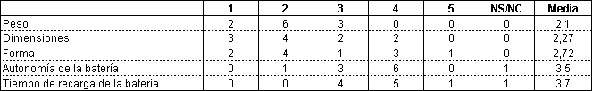 Los resultados sobre las características ergonómicas ( Tabla 3) son consistentes con las expectativas de los deseos de los usuarios de terminales más portables con menor peso y dimensiones. Sin embargo el sistema de alimentación de baterías parece en principio aceptable para los usuarios que valoran positivamente el tiempo de autonomía y de recarga.