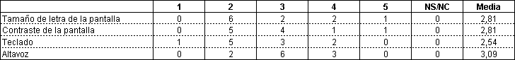 Los datos recogidos sobre las valoraciones de los elementos básicos de interfaz de usuario, es decir pantalla, teclado y altavoz (ver Tabla 4) son elementos críticos de mejora según la apreciación de los usuarios y que confirma aspectos que han sido repetidamente citados como áreas de atención prioritaria en el desarrollo de PDAs y otros sistemas portátiles.