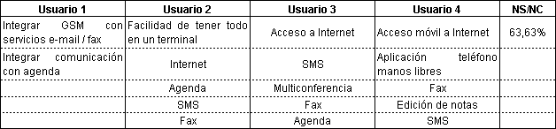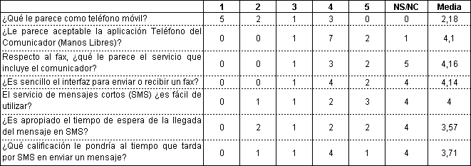 El análisis del uso como teléfono móvil (Tabla 6) arroja una valoración bastante baja para la mayoría de los usuarios, lo que se puede explicar dado las penalizaciones de peso y tamaño del comunicador en relación con la "usabilidad" creciente de los terminales telefónicos de GSM.