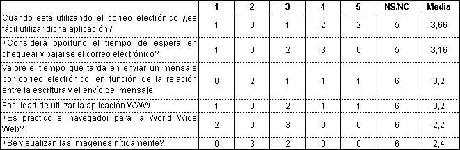 Tabla 7.- Valoración sobre los servicios de Internet de coreo electrónico y WWW. Cada celda indica el número de usuarios del grupo de 11 que adjudican cada valoración, siendo 1 el valor más bajo y 5 el más alto.