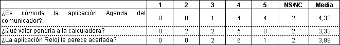 Tabla 6.- Aspectos de comunicación básica. Los valores de cada celda se corresponden con el número de usuarios que asignan el valor de referencia entre 1 (más negativo) y 5 (más positivo).