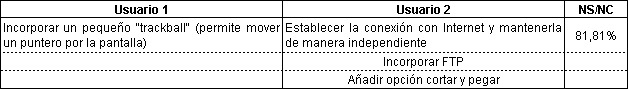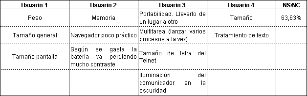 Las características más valiosas que los usuarios han identificado en el comunicador son el acceso a Internet y la facilidad de tener todo integrado en un terminal (ver Tabla 9). Este aspecto se confirma en otras preguntas de la encuesta (Tabla 12). Por su parte las limitaciones principales se centran en características de portabilidad (peso, tamaño) y del visualizador (tamaño letra, iluminación y contraste de pantalla). Otro grupo de limitaciones detectadas se refieren a aspectos de software tales como la posibilidad de multitarea, el navegador y tratamiento de texto (Tabla 10). Consecuentemente se consideran aspectos de mejora estos elementos, incluyéndose además la posibilidad de gestionar varias direcciones de correo, mayor autonomía de batería, y pantalla de color (Tabla 11). También se sugiere la incorporación de elementos de mejora en la interfaz de usuario como un pequeño "trackball" que permita mover un puntero por la pantalla. En el manejo de textos se hecha de menos disponer de la opción de "cortar y pegar".