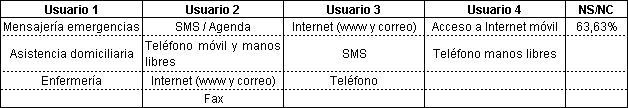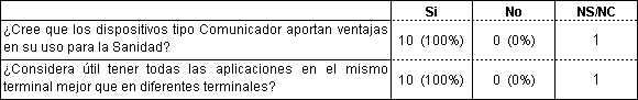 La Tabla 12 muestra unanimidad de opinión sobre las ventajas del uso de esta tecnología en Sanidad así como de las ventajas de integrar todas las aplicaciones en el mismo terminal.