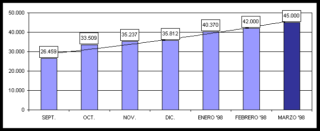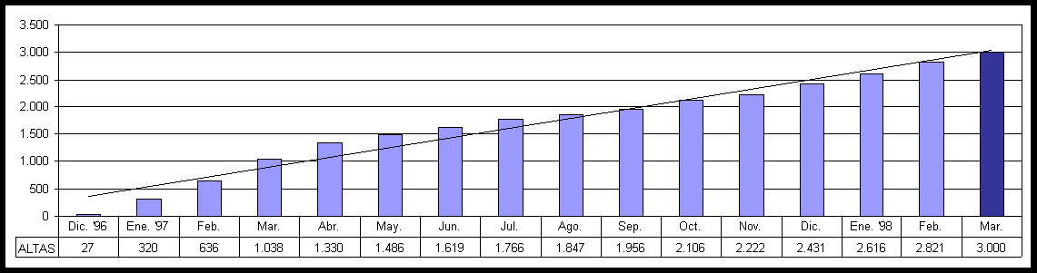 Desde el inicio del proyecto (Diciembre de 1.996) y hasta la fecha, 2.745 médicos se han dado de alta a Internet con METGES on line. Teniendo en cuenta esta cantidad y la voluntad del COMB de seguir apostando por las nuevas tecnologías y aplicaciones de Internet, la previsión para finales de 1.998 es alentadora, pudiendo superar los 8.000 médicos conectados con METGES on line desde las páginas electrónicas de METGES Barcelona, es decir un 35% del total de 22.500 colegiados en el Colegio Oficial de médicos de Barcelona.