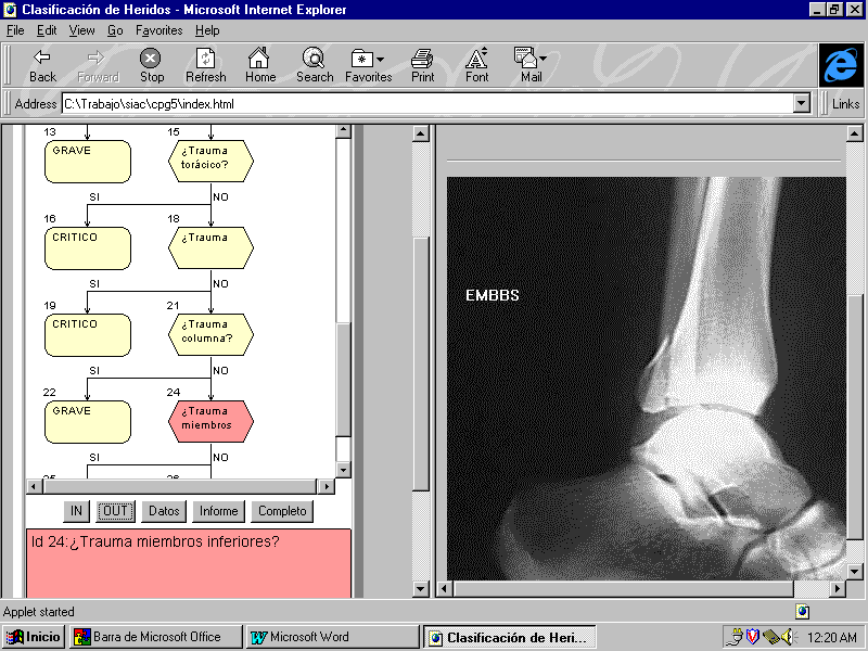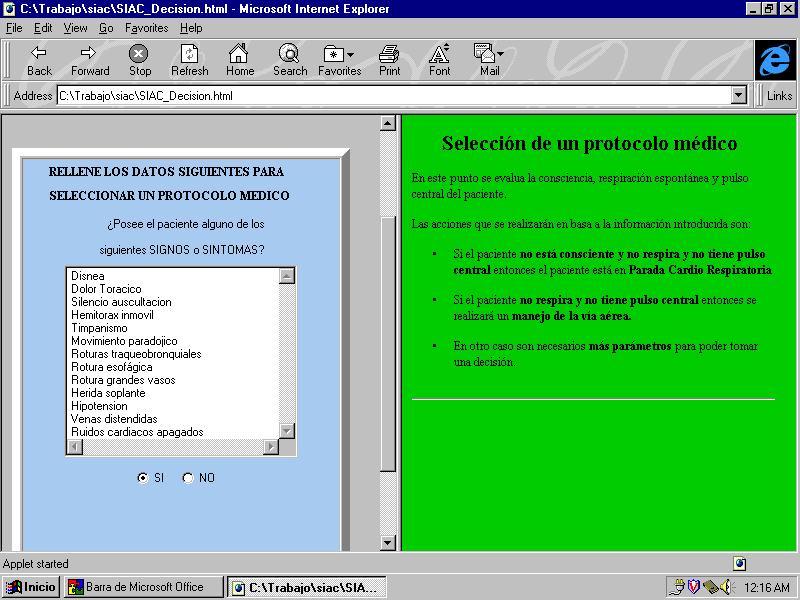 Los protocolos son representados así en forma de diagrama de flujo, con conexiones de los nodos a información multimedia (texto, sonido, gráficos, video), en un formato propuesto por organizaciones de prestigio en el área de la toma de decisiones en medicina [4]. Al mismo tiempo, se ha desarrollado una herramienta de visualización, basada en JAVA, que puede ser utilizada con cualquier navegador estándar (por ejemplo, Netscape or MS Explorer). Los protocolos pueden ser recuperados y utilizados remotamente con cualquier navegador estándar de Internet [5].