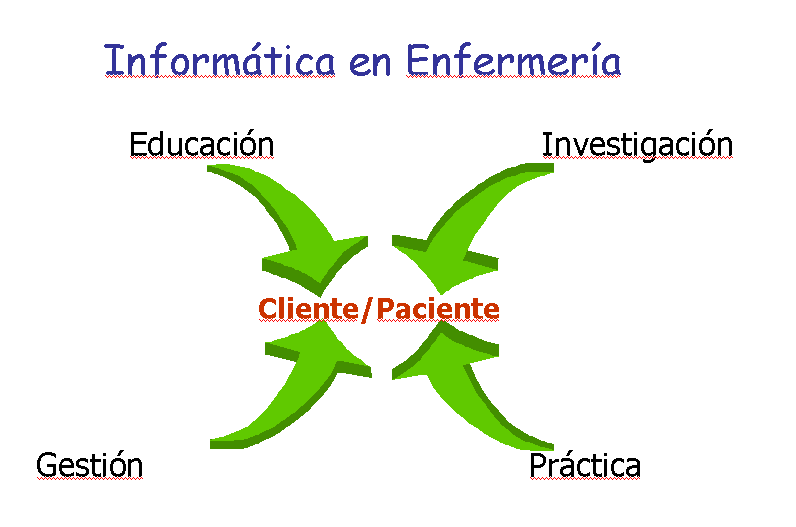 Definió la Informática de la Salud como una disciplina científica que permite obtener, grabar, recuperar, comunicar y usar datos, información y conocimientos relacionados con la práctica sanitaria, utilizando para ello métodos y tecnologías de las ciencias de información para resolver problemas y para apoyar la toma de decisiones con el fin de garantizar la calidad de los cuidados. En principio, la motivación por la tecnología proviene de aspectos económicos y administrativos, debido al convencimiento de que la gestión hospitalaria puede hacerse mejor mediante sistemas informáticos. En cuanto a los cuidados de salud, la tecnología permite manejar con mayor eficiencia condiciones complejas, hospitalizaciones complejas y además los pacientes son dados de alta más rápidamente y a veces sin llegar a estar completamente curados. La tecnología ha sido la causa de grandes cambios en los cuidados de enfermería gracias a la práctica basada en la evidencia, la posibilidad de poder evaluar los resultados y el control de calidad. Todo ello y fundamentalmente por la generalización del uso de ordenadores personales de mesa y portátiles, redes y autopistas de información y la popularización del manejo de PDA’s. Ordenadores de sobremesa Las nuevas TIC permiten el uso, que ya va siendo común de tele-conferencia, comunicación audio-visual, tele-salud, formación a distancia, teleasistencia y exámenes directos. Las principales tareas que se presentan con el uso de la informática en enfermería son: Dicho de otro modo la enfermería tiene que usar el ordenador para innovar, mejorar y rediseñar cuidados de enfermería. Decidir qué debe ser transferido para: Todo ello ayudará a incrementar la calidad de los cuidados que están totalmente relacionados con el acceso al conocimiento e información que tienen los profesionales de la salud para tomar decisiones clínicas. El siguiente esquema intenta resumir lo que hemos dicho hasta el momento.