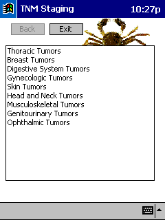 En Pocket PC destaca el Atlas de Anatomía TW de la colección Pocket Library ( https://www.allscripts.com/) y, en Palm, podemos señalar Anatomy 3.0 (Palm), una guía rápida de diez bases de datos que describen diferentes partes del cuerpo humano (http://www.medicalpiloteer.com/) y Kaplan Anatomy To Go! (http://www.pdamd.com/).Cancer Staging and Treatment ( http://www.freewarepalm.com/medical/ cancerstagingandtreatment.shtml) es una aplicación gratuita para Palm que permite localizar rápidamente información sobre estadios de más de 90 tipos de cáncer, con información recogida de Cancernet, National Cancer Institute, National institute of Health (http://cancernet.nci.nih.gov/).Colon Cancer TNM by R. Scott Hannay sigue las normas de la American Joint Cancer Comisión para la estadificación de cáncer de colon. Para el cáncer de mama está disponible Breast Cancer TNM Classification by Daniel L. Stickler, MD. Ambos están disponibles en http://www.handango.com/ y son gratuitos para Palm.