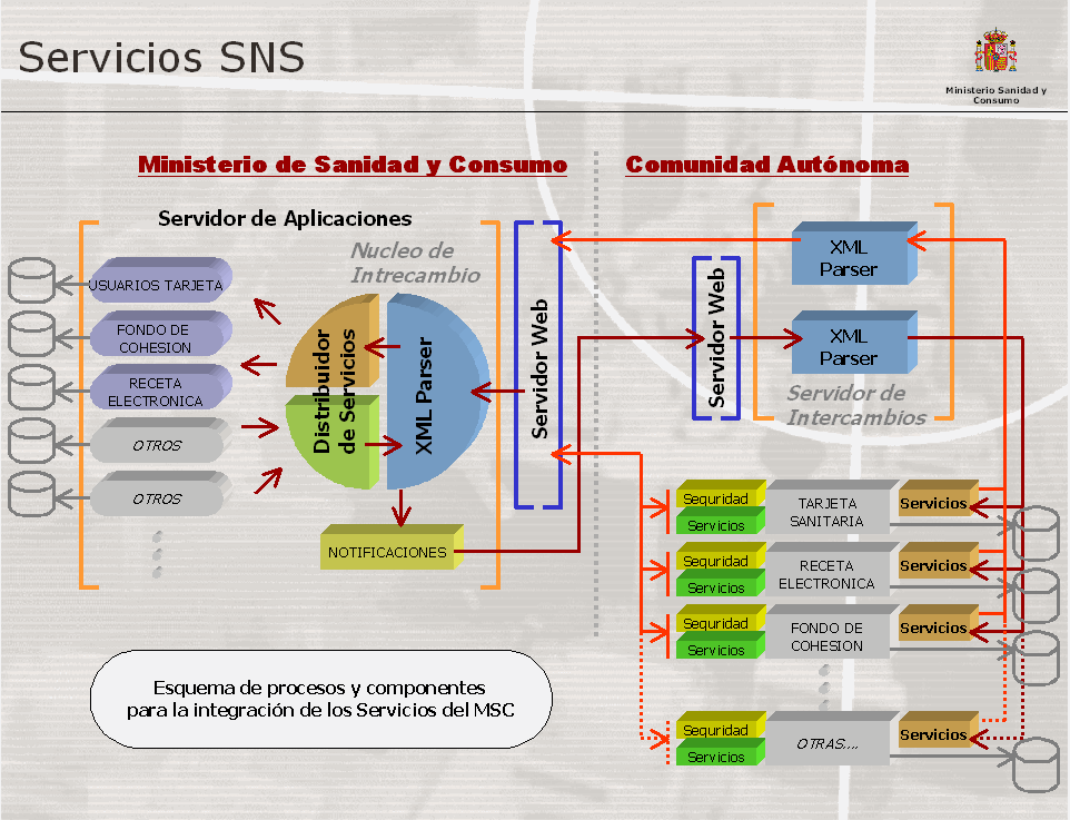 Los servicios del SNS se basan en un esquema de interoperabilidad que posibilita la integración de los distintos sistemas de las CCAA al utilizar estándares de intercambio de información a través de mensajes XML (estándares de mercado de aceptación generalizada) y permitiendo la independencia de las plataformas y de las aplicaciones.