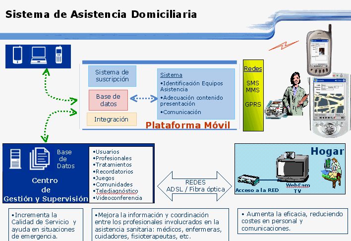 =La prestación de Cuidados Sanitarios (como Farmacéuticos, Enfermería, Dietética, ...) cuya prescripción y/o consulta podrá realizarse de manera mucho más próxima a los escenarios asistenciales finales =Herramientas de Gestión (Cuaderno de Mando, …) para el acceso y control, en tiempo real, a o de diversos indicadores asistenciales Los Proyectos de "Mobility" para la Sanidad integran: =Dispositivos móviles (PocketPC, TabletPC, …) =Tecnología de Conexión =Sistemas de Información y conectan a los usuarios con los datos clínicos y aplicaciones independientemente del lugar y el momento, posibilitando una mayor dedicación a las tareas asistenciales.