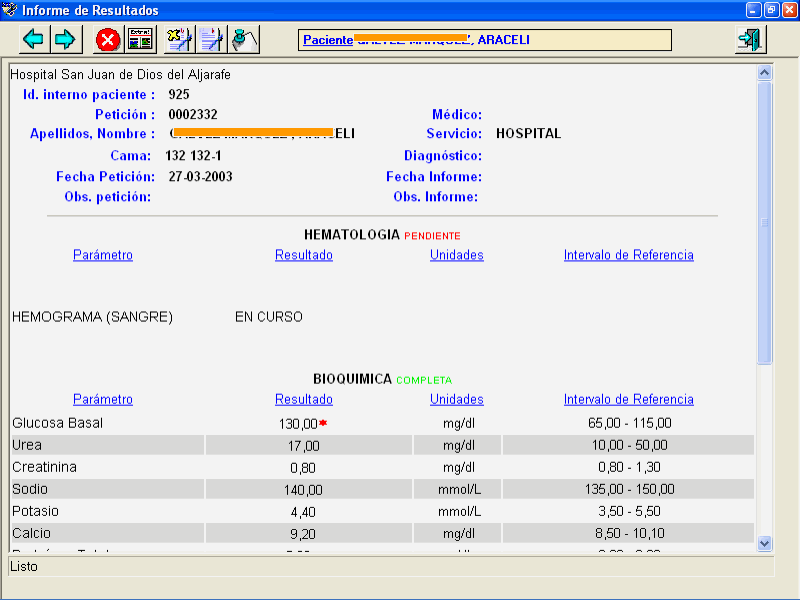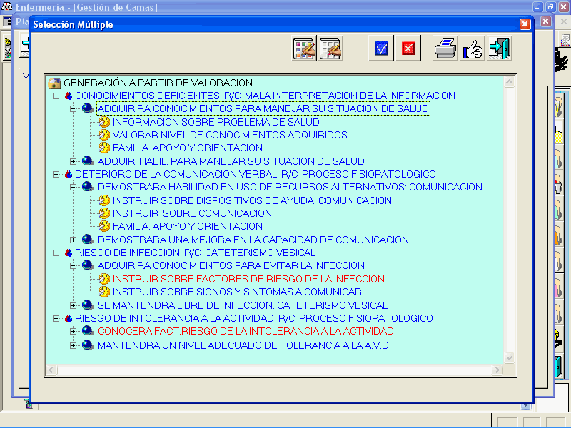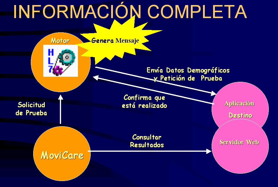 ya que nos proporciona lo que realmente necesita el enfermero: una aplicación sencilla, abierta, actual, que le planifique el trabajo en sus tres vertientes (asistencial, formación e investigación), que cuide al enfermo pero a la vez cuide al propio enfermero. Para poner un ejemplo concreto de la aplicación mostró un experiencia concreta y muy reciente, el hospital de San Juan de Dios del Aljarafe de Sevilla Es un hospital absolutamente nuevo, pertenece a la orden hospitalaria de San Juan de Dios, pero se ha llegado a una acuerdo de concertación con el servicio andaluz de salud. Aún no funciona al 100%, pero si hay ya intervenciones, pacientes ingresados, consultas, rayos, famacia, laboratorio, o sea, la suficiente actividad como para poderla hoy mostrar aquí. Nos sentamos en la unidad de enfermería para que nos realicen una demo. Tomamos un paciente que acaba de ingresar en la unidad, el enfermero le hace su valoración. En este caso se ha elegido la valoración siguiendo el modelo de las 14 necesidades básica de V. Henderson: Alimentación, nutrición, etc Según los datos que se han introducido en el sistema, este nos responde con un plan de cuidados determinado, con diagnósticos, objetivos y cuidados a realizar con una pauta determinada. Podemos anular algunas ramas del árbol marcándolas en rojo. Lo que queda en azul es lo que se genera. Se puede ver cómo de un modo fácil y cómodo se ha conseguido el plan de cuidados completo del paciente. Pero el enfermero necesita mas, necesita tener otro tipo de información no enfermera, como es de analíticas, etc Para ello MoviCare tiene desarrollado un motor de integración basado en el protocolo HL7 mediante el cual genera los mensajes de solicitud de prueba y los envía a la aplicación destino. Cuando la prueba se realiza se envía la información a MoviCare, y desde este se puede consultar los resultados.