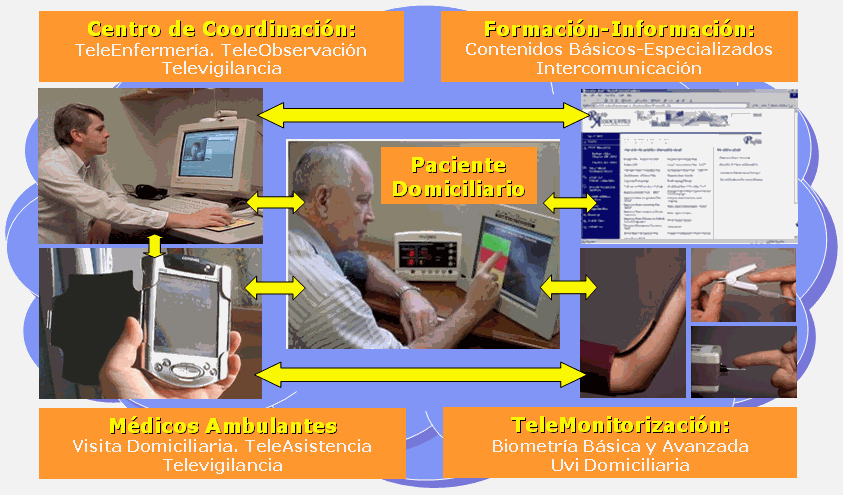 - Procedimientos para TeleObservación, Televigilancia y TeleMonitorización de Pacientes Domiciliarios o ubicados en escenarios no hospitalarios (Centros de Salud, SocioSanitarios, …). Facilitan la colaboración de los Pacientes en los procesos de toma de datos y decisiones y se han planificado analizando su arquitectura global que implica tanto la dotación de Unidades de Coordinación (Enfermería, Data Center, Call Center, …) como a los Médicos Ambulantes y los Pacientes no hospitalizados.Conclusión La definición que la OMS propuso (1998) para el término Telemedicina, refleja perfectamente los objetivos, aportaciones y, en definitiva, aplicaciones, de las Nuevas Tecnologías en Sanidad: "Las nuevas tecnologías están potenciando la Distribución de servicios de salud en un medio en el que la distancia es un factor crítico y donde los profesionales de la salud usan información y tecnología de comunicaciones para el intercambio de información válida para el diagnóstico, tratamiento y prevención de enfermedades o daños, investigación y evaluación así como la educación continuada de los proveedores de salud pública".