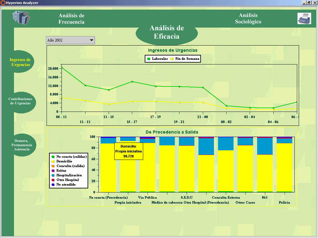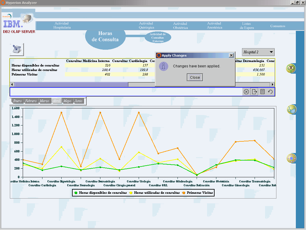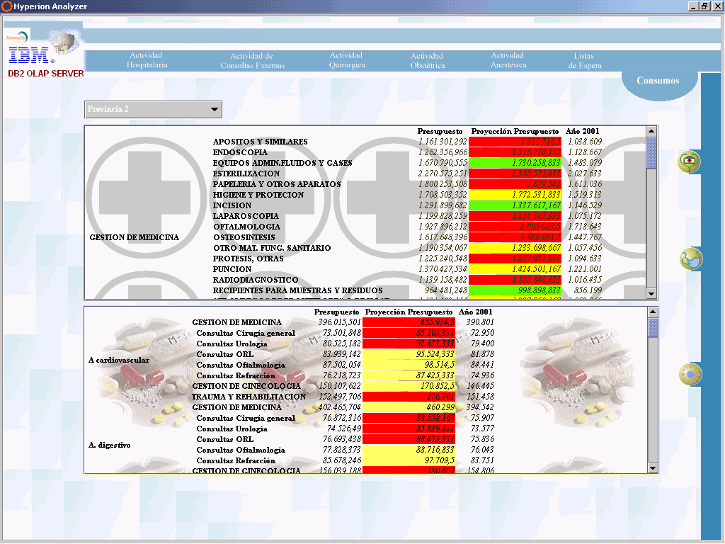 La mayoría de los hospitales no tienen cubiertas sus necesidades más básicas de obtención de información. La información existe, pero los datos no se encuentran en el estado adecuado como para poder realizar análisis sobre los mismos. Dentro de un hospital se plantea la misma problemática todos los meses: realizar los cuadros de mando del hospital. Empieza la pesadilla mensual para el departamento de informática y para los responsables de cada área del hospital. El proceso es el siguiente: Los responsables de cada área les envían ficheros resumen del mes con la información que hay que incorporar en el cuaderno de gestión. Esto, en el mejor de los casos, porque la realidad es que el informático tiene que pedir la información a los responsables de cada área y después preguntarles si la información obtenida es la que realmente se quiere incluir y si es correcta. Además, en el caso de que le envíen la información en un formato de hoja de cálculo cada responsable le mandará un formato diferente con el consiguiente esfuerzo en homogeneizar las diferentes informaciones en una única. Podemos concluir, básicamente, que la cantidad de tiempo invertido cada mes en realizar el mismo trabajo es excesiva y que la probabilidad de cometer errores es muy alta. Si la información que manejamos cada mes es, en un porcentaje elevado, prácticamente igual a los meses anteriores y, además las fuentes que contienen la información son siempre las mismas, ¿por qué no empleamos el tiempo en definir un sistema de creación y automatización de los procesos para generar los cuadros de mando?. Además podemos construir sistemas que permitan acceder a la información por parte de los usuarios sin tener que pasar por los departamentos de informática. El beneficio obtenido invirtiendo en este tipo de sistemas es muy alto, no sólo porque las personas implicadas en el proceso manual van a dejar de realizar esta tarea y, como consecuencia, podrán realizar otras más orientadas a su perfil, sino que además conseguiremos la muy deseada confianza en la información. Por si fuera poco, este tipo de sistemas permiten a los usuarios estar conectados on-line, por lo que las peticiones nuevas podrán ser incluidas en el sistema por los mismos usuarios. Una de las soluciones planteadas por IBM es la utilización de bases de datos multidimensionales, IBM DB2 OLAP SERVER, orientada al análisis, muy rápida en cuanto al acceso a la información y al desarrollo del entorno, óptima para entornos donde se requieren simulaciones y muy cercana al usuario. Además, este tipo de soluciones requieren productos muy gráficos y sencillos de manejar. Con DB2 OLAP Server Analyzer los usuarios acceden a un entorno gráfico e intuitivo desde sus puestos de trabajo ó desde cualquier punto con acceso a la Intranet del hospital. DB2 OLAP SERVER contiene metodología de minería de datos, de detección de desviaciones en la información, permitiendo a los usuarios acceder a aquella información que se haya desviado respecto a un valor esperado, y, de esa forma, mejorar el proceso de toma de decisiones. Ejemplos de Cuadros de mando