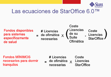 Por otra parte Sun Microsystems es el mayor aportador al mundo de software libre, colaborando con partes sustanciales de Solaris™ y con la suite ofimática OpenOffice que es una versión para el mundo de software libre de StarOffice 6.0, privada de un gestor de base de datos propio (aunque enlaza con otros), y operativa con las reglas de juego del software libre. Según Eloy "Por su disponibilidad sobre Windows, Linux y Solaris™, la convierte en líder indiscutible en el mundo del software libre y totalmente compatible con StarOffice™ 6.0 y MS Office™ ". Como conclusión, Eloy presentó las "ecuaciones" de StarOffice™ 6.0 que se formulan así: "Primera: Los fondos disponibles para sistemas específicos de salud son iguales al producto del número de licencias de ofimática necesarias por la diferencia entre el coste de la licencia ofimática habitual y el coste de una licencia de StarOffice". "Segunda: Los fondos necesarios para "dormir tranquilos" son iguales al número de licencias de ofimática necesarias por el coste de una licencia de StarOffice".