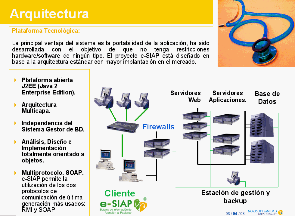 Por ultimo tomó la palabra D. Antonio Castillo Romera con su ponencia "e-SIAP: centralización de datos en atención primaria" D. Antonio Castillo Romera con su ponencia "e-SIAP: centralización de datos en atención primaria" Comenzó su presentación haciendo una pequeña introducción sobre el trabajo de su empresa: "La incorporación de los avances tecnológicos al Sector de la Sanidad ha sido la misión principal de Novasoft Sanidad desde sus inicios hace más de 9 años. Durante estos años hemos desarrollado diversas soluciones informáticas para las distintas áreas del sector salud y contribuido a la mejora de la calidad de los servicios asistenciales de la red sanitaria española y de otros países latinoamericanos, ayudando a los profesionales médicos a explotar la información clínica de una manera más eficiente, con herramientas clínicas intuitivas y de fácil manejo. En Novasoft Sanidad tenemos claro que nuestra misión principal es mejorar la comunicación entre todos los estamentos de la Red Sanitaria, haciendo lo que mejor sabemos hacer: desarrollar soluciones tecnológicas que se adapten a la necesidad creciente de automatización de la Información Clínica y que permitan al profesional sanitario disponer de las últimas tecnologías a cualquier hora y desde cualquier lugar." Después hizo un recorrido entre SIAP-Win y e-SIAP. "e-SIAP es el desarrollo tecnológico de SIAP-Win, un producto con más de 9 años de experiencia en el mercado. Se trata de un Sistema de Información de Atención a Pacientes que permite gestionar a proveedores de cuidados en salud las historias clínicas de sus pacientes / clientes. e-SIAP ha incorporado lo último en tecnología JAVA . Permite abarcar proyectos tanto de centralización de la Historia Clínica Electrónica, como proyectos tradicionales cliente/servidor. La aplicación e-SIAP incorpora nuevas funcionalidades, además de reorganizar las existentes en SIAP-Win, aprovechando toda la potencia inherente a las nuevas tecnologías, en concreto, a la plataforma J2EE. e-SIAP es un entorno abierto que permite la integración con otros sistemas de información. También Integra la información del Centro con las Áreas de Gestión, Hospitales de Referencia, Centros de Especialidades u otros organismos o corporaciones que se deseen, de forma que proporciona una Historia Clínica Única y Completa a lo largo de la vida del paciente." CARACTERÍSTICAS DEL e-SIAP: -Multiplataforma. Tecnología JAVA. Puede ser ejecutado en cualquier entorno que permita una máquina virtual de JAVA. AIX, HP-UX, IRIX, Linux, Reliant UNIX, Solaris, UnixWare, W 2000, Windows NT. -Multicapa. La tecnología de 3 capas permite fácilmente cambiar el interfaz de usuario, de esta forma es casi inmediato el desarrollo de nuevos interfaces para otros dispositivos, como móviles, PDAs (Pocket-SIAP) o un navegador de internet. -Multicentro, desde una única base de datos se pueden gestionar tantos centros como se deseen con sus correspondientes recursos y profesionales. Los pacientes pueden ser compartidos entre centros o asignados a centros concretos. -Multiusuario con gestión de perfiles de seguridad para el acceso y uso de los datos. -Multilenguaje. Se puede traducir o configurar todo el sistema sin necesidad de modificar el código fuente ni compilar. Se pueden crear tantos lenguajes simultáneos como se deseen. -Adaptado al reglamento de confidencialidad y protección de datos de la LOPD española. (antes LORTAD). Todas las contraseñas van encriptadas, las de acceso a la aplicación (login) y las de acceso a BD. La información sensible del paciente que está en el terminal queda oculta cuando el usuario de la aplicación no está usándola, la información sensible que se envía por la red va encriptada, etc. -Entorno Gráfico muy cuidado. Funcionalidad y estética de alta calidad. Desarrollada utilizando toda la potencia gráfica de Swing JAVA con propiedades multiplataforma. -Independiente del Gestor de Bases de Datos. Acceso nativo a los principales gestores de bases de datos Oracle, Informix, Sybase. Compatibilidad con SIAP-Win al 100% haciendo que la migración a e-SIAP sea prácticamente inmediata (ambas aplicaciones comparten el mismo modelo de datos) -Distribución de Software por internet, con sistema de actualización de versiones remoto. Gracias a la implementación centralizada de e-SIAP la gestión de las actualizaciones se realiza de forma automática al conectarse al servidor. Así se garantiza que cada usuario disponga siempre de la última versión. La arquitectura es la siguiente: El escenario de implantación posee una base de datos única para todos los pacientes del área, una interconexión y sincronización con bases de datos poblacionales (Tarjeta Sanitaria). Es una solución tecnológica para los consultorios remotos. Además se tiene la posibilidad de montarla sobre múltiples plataformas hard y soft. Se puede activar "log" para la realización de auditorias además de la encriptación de los datos que circulen por la Intranet (incluidas claves de acceso).