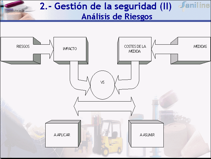 Moderador: D. Julián Montalbán. Jefe de Área de Programas Nacionales I+D. Secretaría General de Comunicaciones. Ministerio de Ciencia y Tecnología. Ponentes: D. Raúl García Vega. Responsable de Seguridad y Sistemas de SANILINE. D. Francisco Javier López Fernández. Senior Manager. Altares Consulting D. José Miguel Calderón. Gerente de Soluciones para Sanidad. Microsoft Ibérica. En primer lugar Raúl García Vega se encargó de la ponencia "Seguridad en las Tecnologías de la Información", preguntándose si es seguro realizar transacciones comerciales a través de Internet; ¿con qué problemas de seguridad nos enfrentamos?. Para garantizar la seguridad es necesario ofrecer un servicio 24x7x365 y proteger a la empresa contra todos los posibles delitos informáticos o abusos de la red (DoS, Intentos de Intrusión,Virus...). Al mismo tiempo debe haber absoluta fiabilidad en las transacciones (Autenticidad,Confidencialidad,Integridad y Norepudio) y atenerse a los requisitos legales (LOPD,LSSI). Resumiendo debemos mantener, en cualquier caso la CONFIDENCIALIDAD - INTEGRIDAD- DISPONILIDAD de la información. Hay que partir de la base de que la Seguridad Informática no solo es muy importante, necesaria sino también obligatoria. Para gestionar la seguridad SANILINE utiliza el método de análisis de riesgos. Para ello se ocupan de Identificación de los activos o ámbito Físicos: Servidores, Comunicaciones,Software,Aplicaciones.. Lógicos: Catálogos, Identificación de las amenazas Priorización de amenazas, impactos Identificar las contramedidas Evasión,Seguridad,Detección o Recuperación Análisis del coste Beneficios.