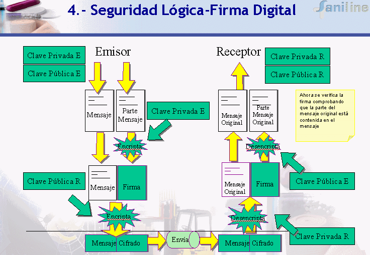 La seguridad física y la disponibilidad de servicios quedan reflejados en la siguiente tabla. Las contramedidas para los ataques de Red y Abusos el ponente las resume en: Intrusión Detection (ID) y Response Sensores de red o de servidor Sensores de Firma o de aprendizaje Tipos de Firewall Filtrado de paquetes Firewalls de Aplicación Firewalls de Inspección de Estados Diseño de arquitectura de seguridad En cuanto a la seguridad lógica utilizan el cifrado de llave simétrica mediante Ks para convertir el texto plano en cifrado y viceversa. Se trata de un método rápido y seguro (dependiente del tamaño de la llave). El texto cifrado es del mismo tamaño que el texto plano. El número de llaves a tener es igual al cuadrado de los participantes. Lo importante es mantener la Ks en secreto, pero ¿cómo hacerlo?. Sencillamente lo que se encripta con una llave solo se desencripta con la otra. Es más segura la transmisión de llaves que la criptografía simétrica. Hay que advertir que el número de llaves es igual al número de participantes. Los algoritmos lentos, expanden el texto cifrado (llaves largas). La firma digital que utiliza SANILINE se resume en el siguiente gráfico: Las principales aplicaciones de la seguridad lógica son: Certificados digitales Autoridad de Certificación Revocación de certificados Soporte para no repudio Timestamping Aplicaciones: S/MIME , PEM,SET,SSL,IPSEC,S-HTTP... Finalmente habla del Proyecto CERES (CERtificación ESpañola) que lidera la Fábrica Nacional de Moneda y Timbre, y que en líneas generales, consiste en establecer una Entidad Pública de Certificación, que permita autentificar y garantizar la confidencialidad de las comunicaciones entre ciudadanos, empresas u otras instituciones y administraciones públicas a través de las redes abiertas de comunicación. En cuanto a otros dominios de seguridad cita: Controles Administrativos ( Privilegios,Perfiles) y Accountability Bussiness Continuity Plan Disaster Recovery Plan Seguridad Física Auditoría y Certificación bajo ISO 17799 Normativas legales LOPD y LSSI Como conclusiones se pregunta si es seguro establecer relaciones empresariales a través de internet, admitiendo que: Existen amenazas (no solo internet) Hay que tener claro qué queremos proteger y determinar su solución Determinar inversion vs impacto Determinar soluciones: Seguridad Física,Red,Lógica, BCP, Planes de Backup, Políticas de seguridad...è PLANES DE SEGURIDAD Mantener y monitorizar nuestros sistemas, comunicaciones y aplicaciones