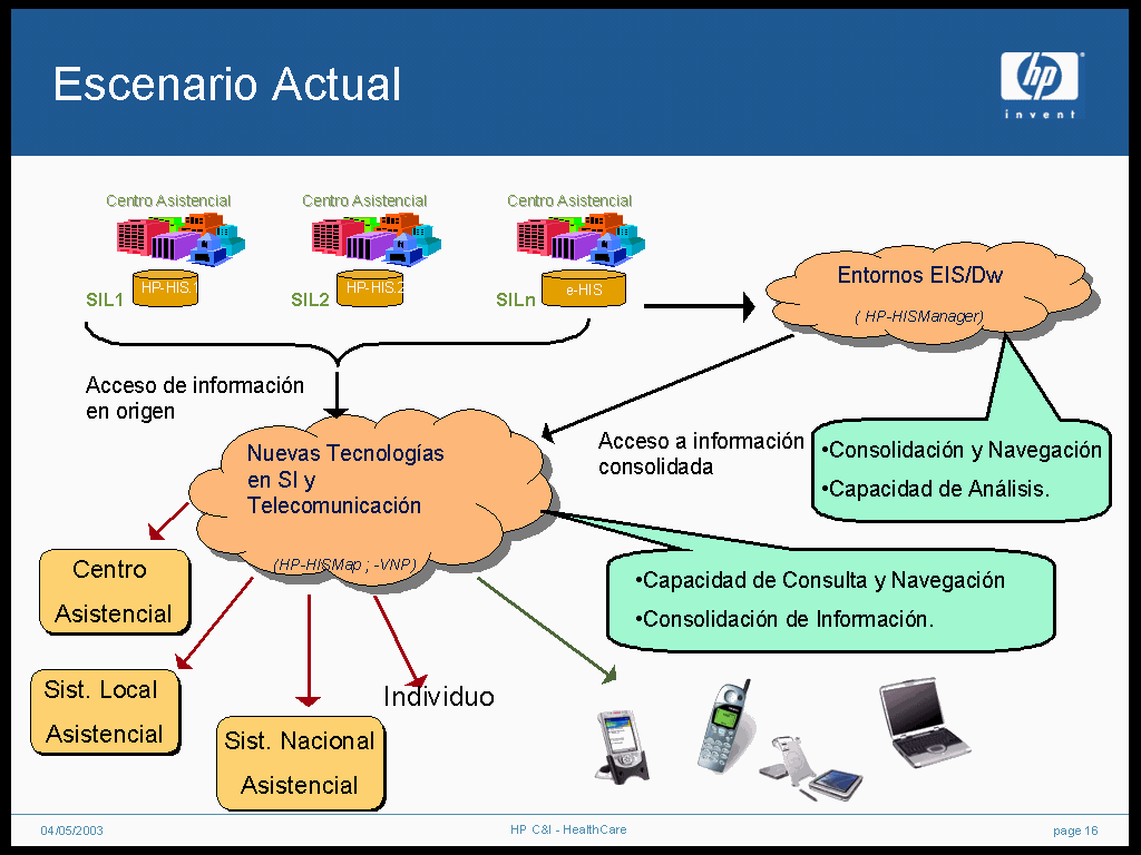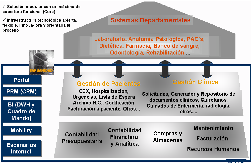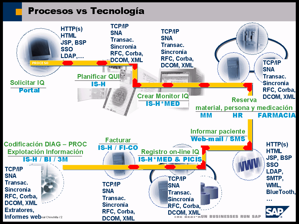 Marcial Chinchilla y Tomás Manzanares expusieron un ejemplo práctico de "Procesos de Integración para una correcta gestión sanitaria". Los procesos vs tecnología lo resumen los autores con la siguiente transparencia: Una de las problemáticas comunes y actuales en los sistemas de información de salud es su gran dispersión (centrales, departamentales, etc.) Además, a veces, las distintas soluciones se solapan funcionalmente. Cada sistema tiene su tecnología propia y su propio diseño. Por tanto, van a existir restricciones tecnológicas para integrar las distintas soluciones y el diseño de procesos va a verse afectado por dichas restricciones. Afirman que: La tecnología subyacente a los sistemas debe permitir separar la funcionalidad de la tecnología que la soporta. De tal forma que podamos tener la libertad de definir los procesos tal como son o como deseamos que sean, independiente de la tecnología. Para ello Hay que Configurar / Parametrizar por separado: qué procesos vamos a integrar en los distintos sistemas de cómo técnicamente se va a hacer dicha integración Los requisitos que deben exigirse a una tecnología son: Abierta ----------------à con soporte de estándares. Flexible ---------------à capaz de adaptarse. Innovadora-------------> con garantía de evolución O 0rientada al procesoà debe concebirse para abstraer la complejidad tecnológica de la funcionalidad. No existe en el mercado una única solución que cubra todo el abanico funcional de todos los sistemas que necesitamos en el ámbito de la salud. Estamos, para bien o para mal, obligados a comunicarnos e integrarnos con terceras aplicaciones. SAP propone una solución mixta, que desde una solución modular, exista un núcleo (CORE) que aporte un máximo de cobertura funcional bajo la misma solución y que además disponga de una tecnología de integración que permita "hablarse" y "comunicarse" bajo estándares con aplicaciones terceras externas al mencionado CORE. La solución SAP se resumen en la transparencia siguiente: